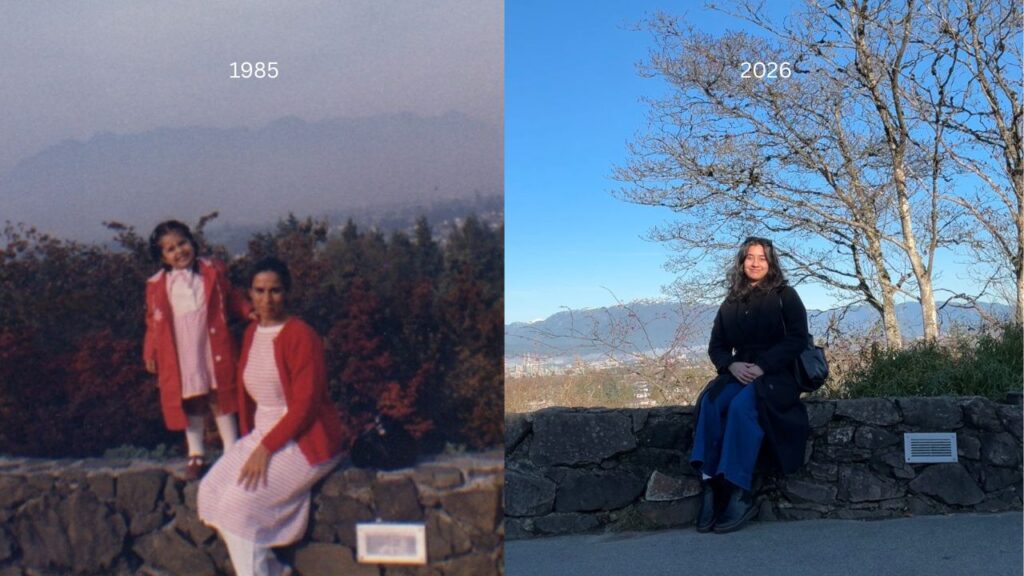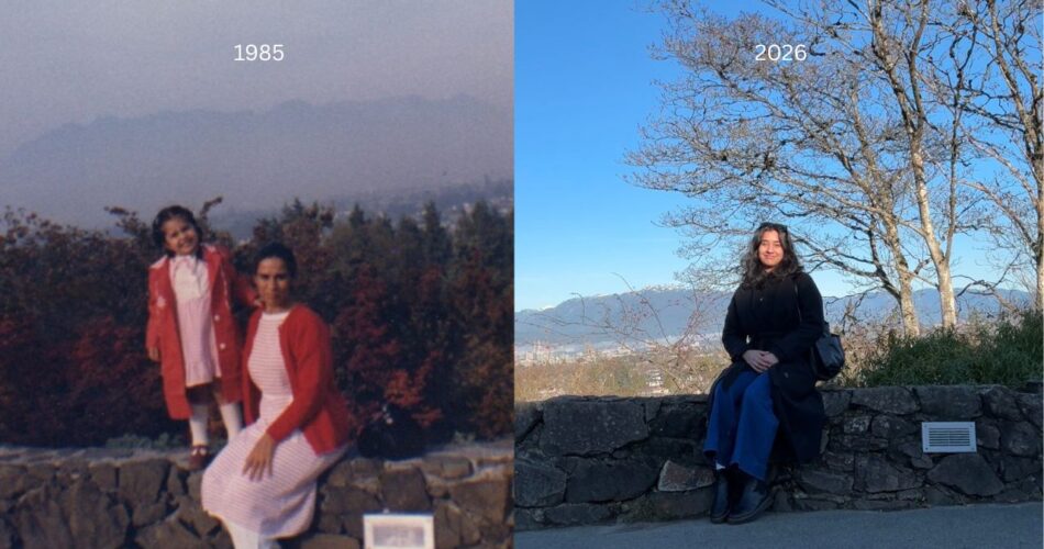 I see the conservatory. A nostalgic image even though I can count on my hands how many times I’ve seen it. It’s the mountains maybe. The trees below and to each side. It’s how the city stretches out like an ocean. The sun glinting off the glass and metal as if they were waves. As if they were about to rise and break. How the buildings and towers seem to cascade from this angle. Seeing it from above like you’re on your way to heaven. How is the view from up there? What do I look like right now? It’s just me and my long coat — a long coat you may have liked. I will never know what you might say. But I remember the pictures. Ah, that’s what it is. This nostalgia, printed into freezed frames. Were they black and white? No. I go back into my mind and see it again. The colour of your dress. White and pink stripes. A red cardigan. The curve of your face, the placement of your hand. This wall — not even three feet tall, you sat. Knees together, body at an angle, a pose you might be asked to assume for school photos. There is a child to your left.